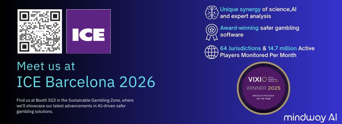 We’re excited to announce that Mindway AI will be part of the premier event for the gaming industry, ICE Barcelona 2026. Visit us at Booth SG3 in the Sustainable Gambling Zone to explore our cutting-edge AI-driven solutions designed to enhance safer gambling practices.