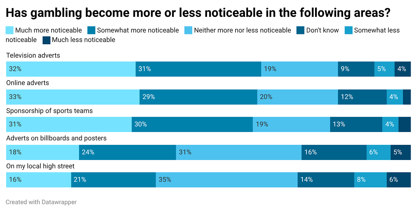 A visible problem: A single chart from the report set the scene. Asked whether gambling has become more or less noticeable across various parts of public life, the majority said it is more visible almost everywhere.