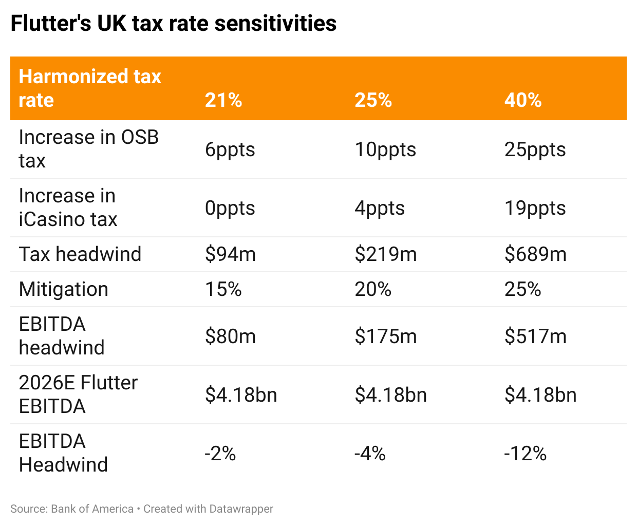 The new analysis from Bank of America makes it plain the extent to which Flutter – and by extension the rest of the UK-facing operators – are sensitive to tax hikes.